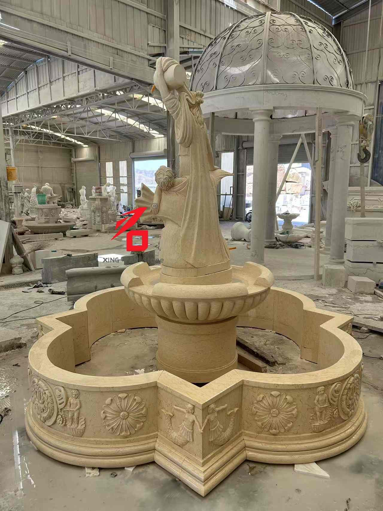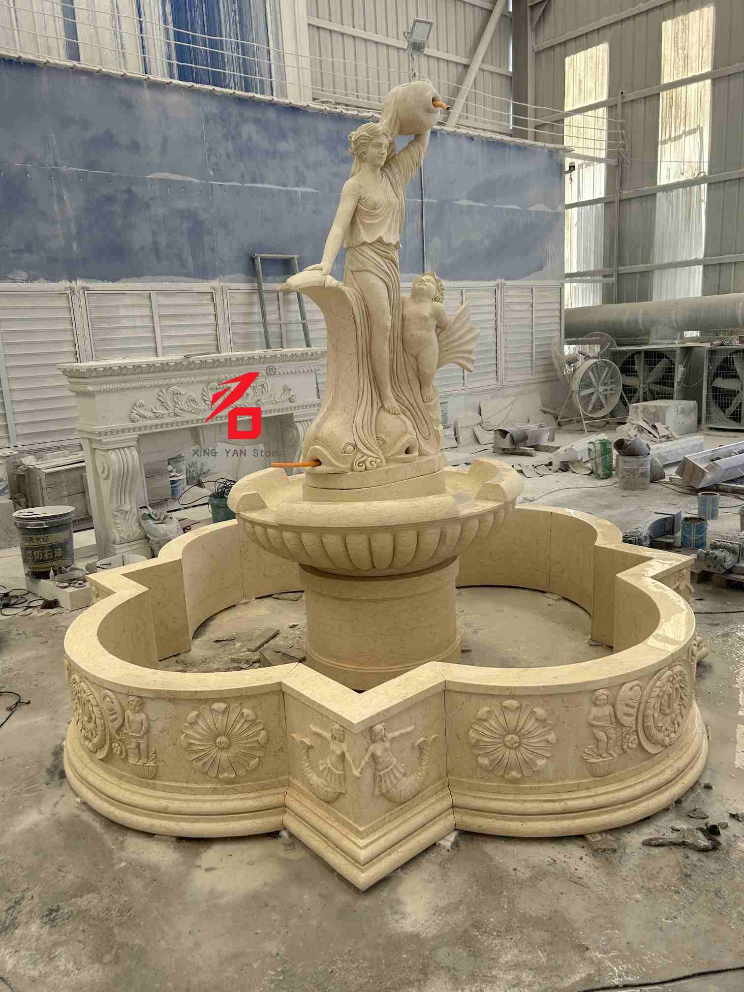 Steenopties: Aangepaste steenopties omvatten beige marmer, wit marmer, zandsteen en andere natuurstenen. De fijne textuur, de warme kleur en de sterke weersbestendigheid van de steen zorgen voor de duurzaamheid en esthetische aantrekkingskracht van de fontein voor langdurig buitengebruik. Vakmanschap van snijwerk: Met behulp van traditionele handsnijtechnieken bewerken ervaren beeldhouwers elk detail nauwgezet, van de gezichtsuitdrukking en draperie van de godin tot de kind- en visvormige ornamenten, waardoor de artistieke textuur en driedimensionaliteit van de Europese klassieke beeldhouwkunst wordt getoond.