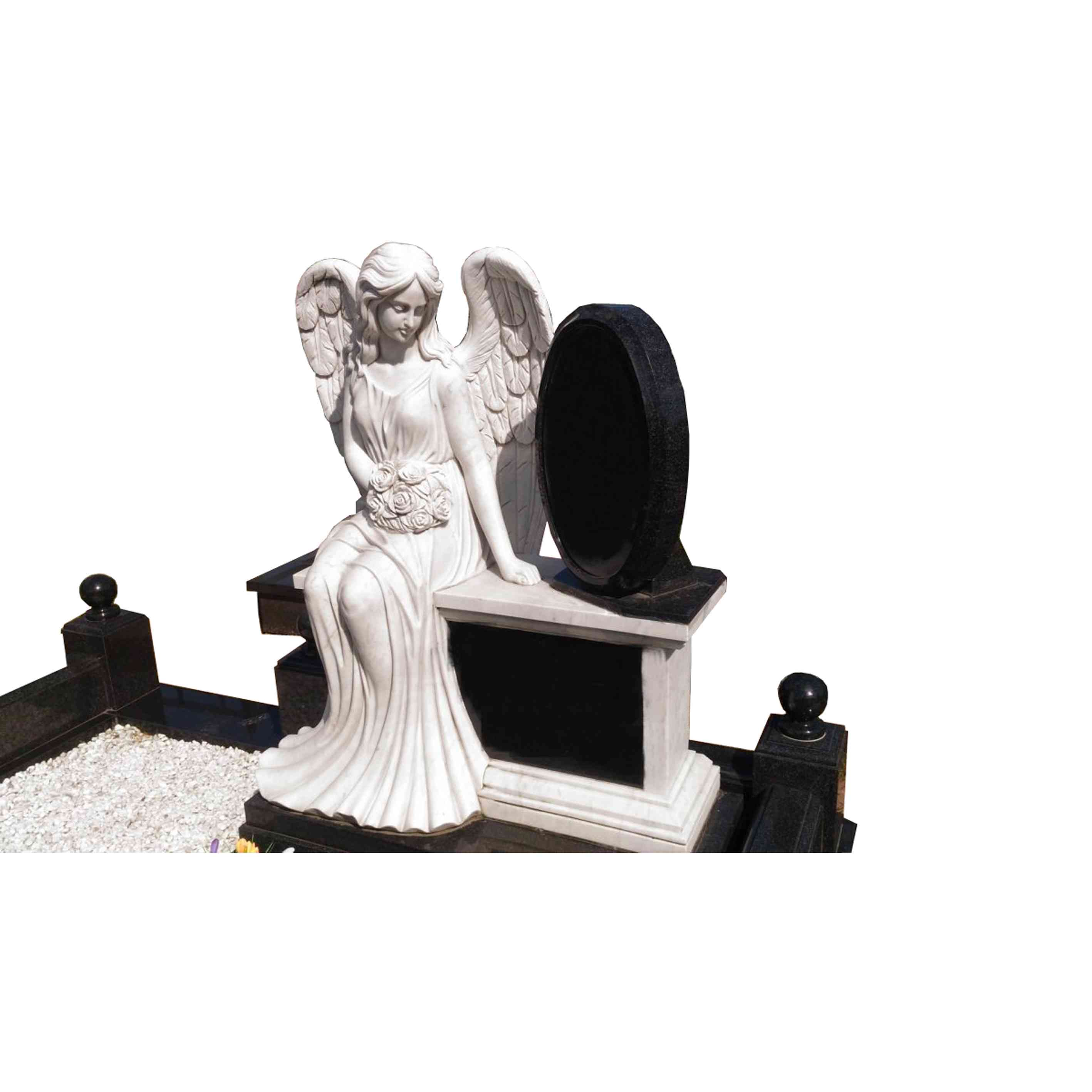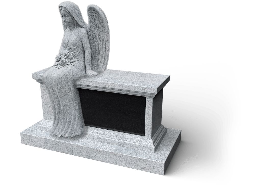 Zwarte granietbank met zittende engelenstandbeeld